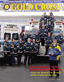 Members of the Wayne First Aid Squad on the Cover of the Gold Cross, The Magazine of the New Jersey State First Aid Council, receiving the award for “Outstanding Volunteer EMS Agency” presented by council President Sue Van Orden.
